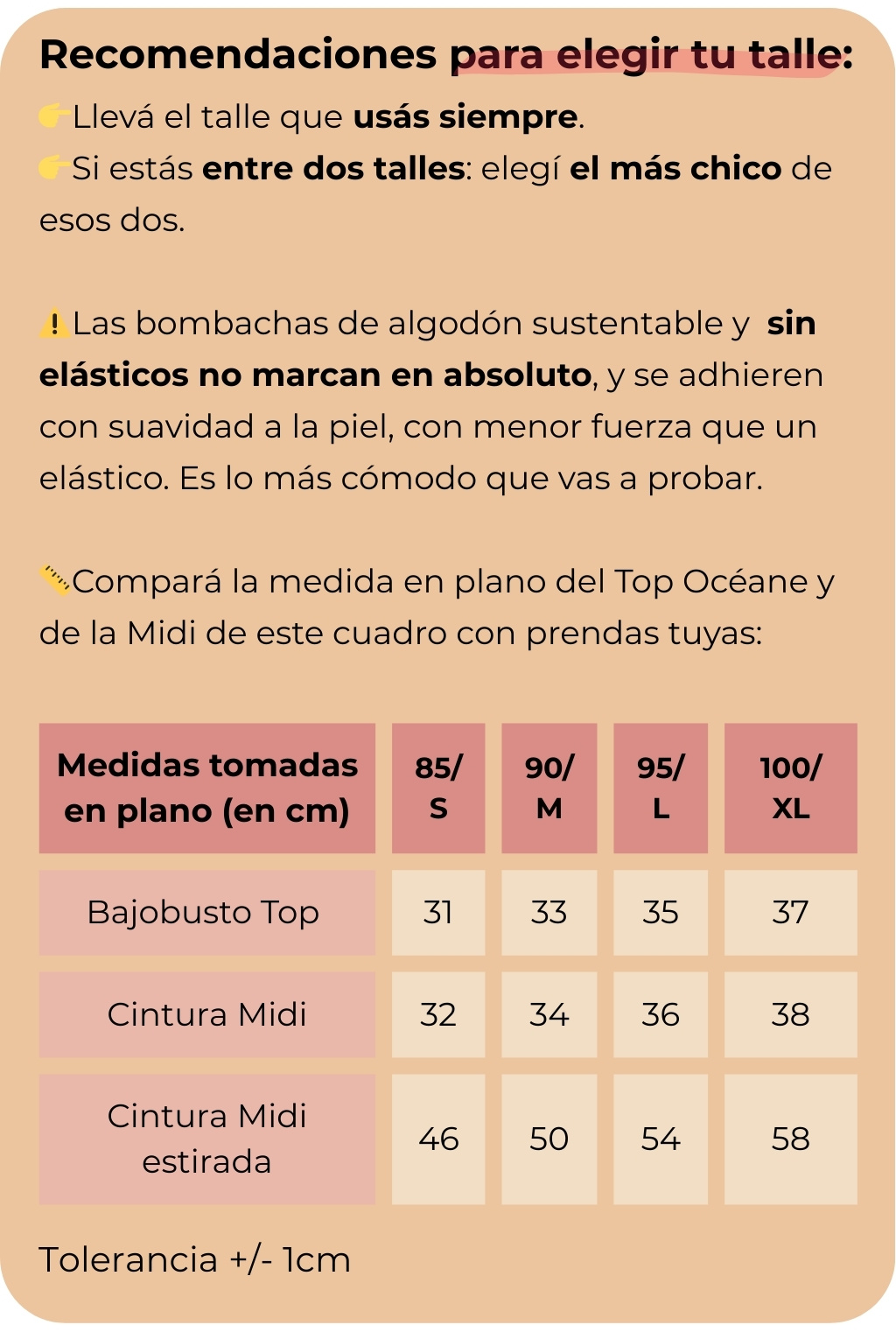 📏 El top viene del talle 85 al 100. Las bombis del S al XL.