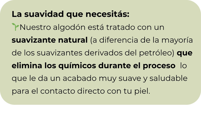 🌱La mayoría de los suavizantes son derivados del petróleo, a diferencia de esto, nuestro algodón está tratado con un suavizante natural que elimina los químicos durante el proceso, lo que le da un acabado tan suave y saludable para el contacto directo con tu piel.